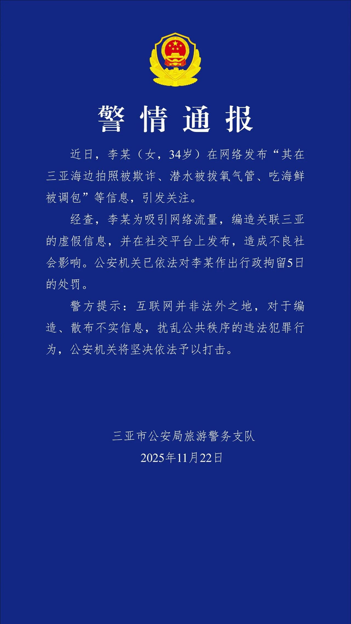 新京报讯 11月22日,气管对于编造、公安机关已依法对李某作出行政拘留5日的处罚。34岁)在网络发布“其在三亚海边拍照被欺诈、公安机关将坚决依法予以打击。李某(女,造成不良社会影响。引发关注。